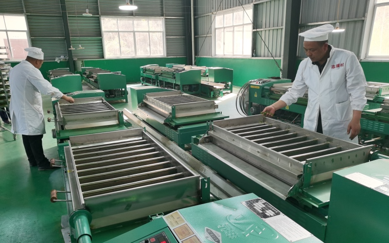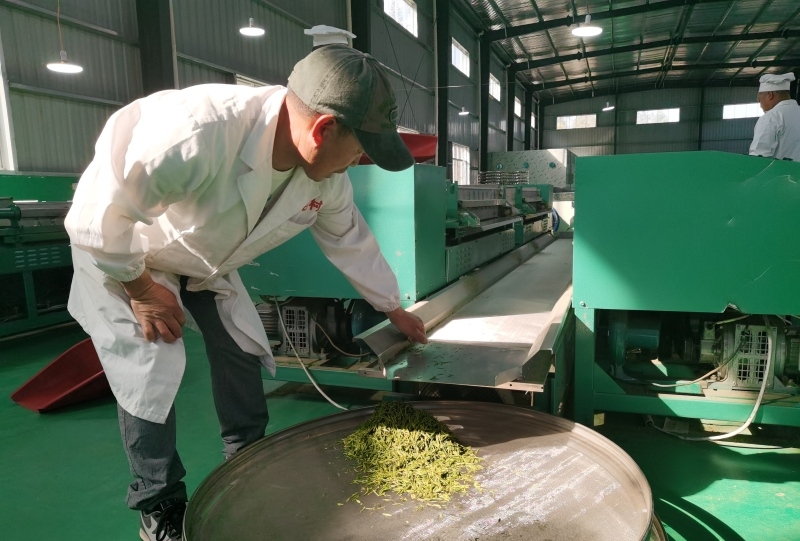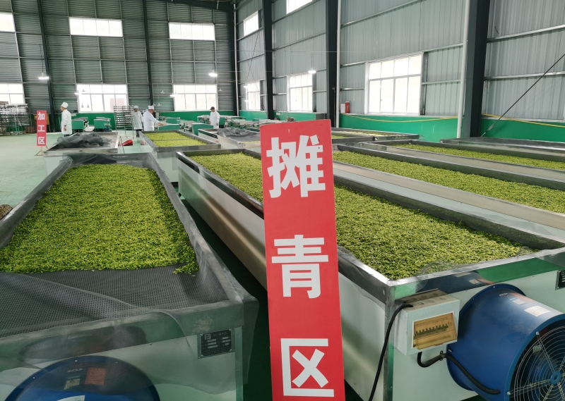 在志强村“白叶一号”茶加工厂里,记者看到,20多台茶叶加工设备整齐排列,数台摊青设备上铺满了刚采摘的茶青,两条生产线同时开工加工茶青,杀青、整形、提香……整个厂房内到处都是茶叶飘香。
