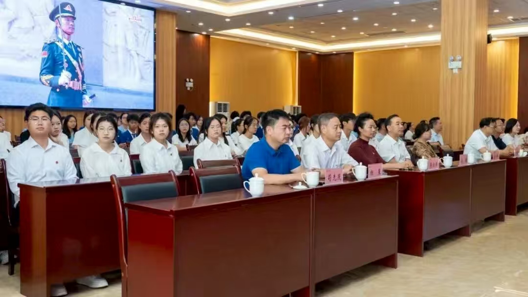 9月3日上午9时,贵州商学院学校党委领导班子成员和全体教职工师生齐聚在静心湖会议中心和各教学楼教室,共同收看纪念中国人民抗日战争暨世界反法西斯战争胜利80周年大会现场直播,退休老同志和无课老师自行收看大会。当激昂嘹亮的国歌响起时,现场师生全体起立,齐唱国歌,会场一片肃然。