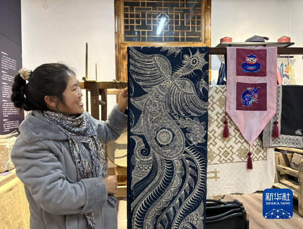 翁井村民俗文化体验馆工作人员展示蜡染手工作品。新华社记者 李凡 摄