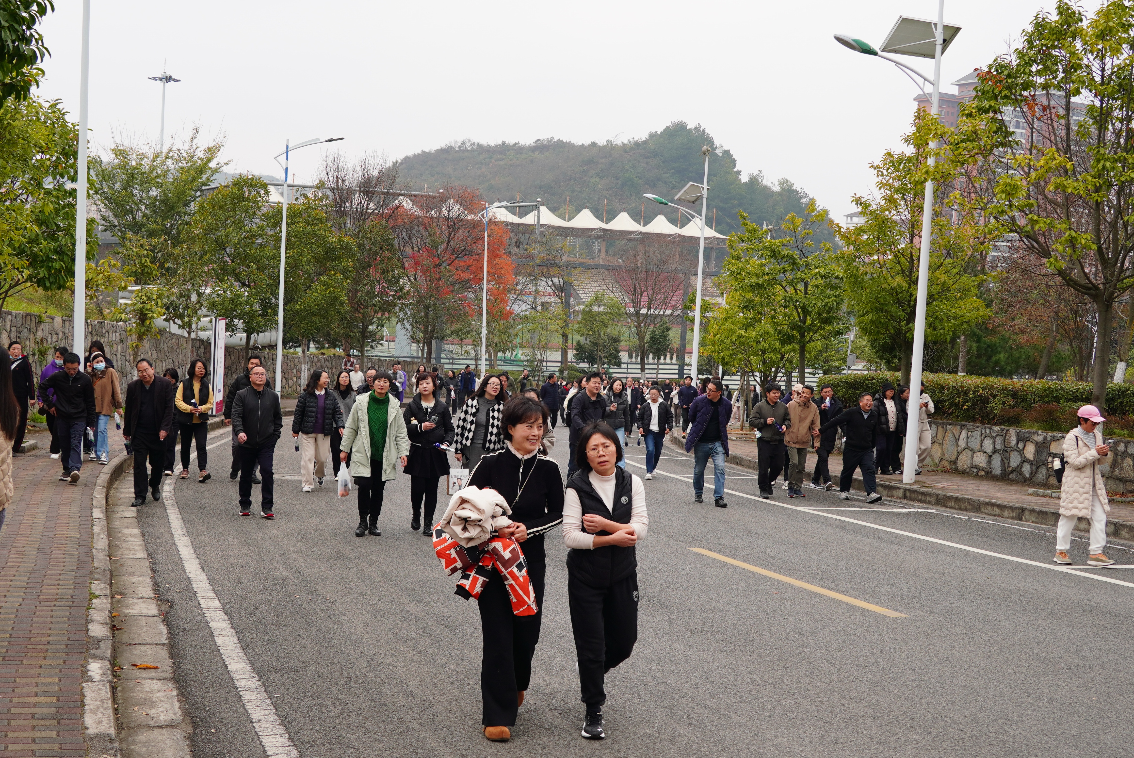 活动伊始,教职工们齐聚体育馆。校长李汉文为活动致辞,校党委副书记唐本文鸣笛发令。笛声响起后,队伍从体育馆有序出发,沿公租房侧环山公路前行。