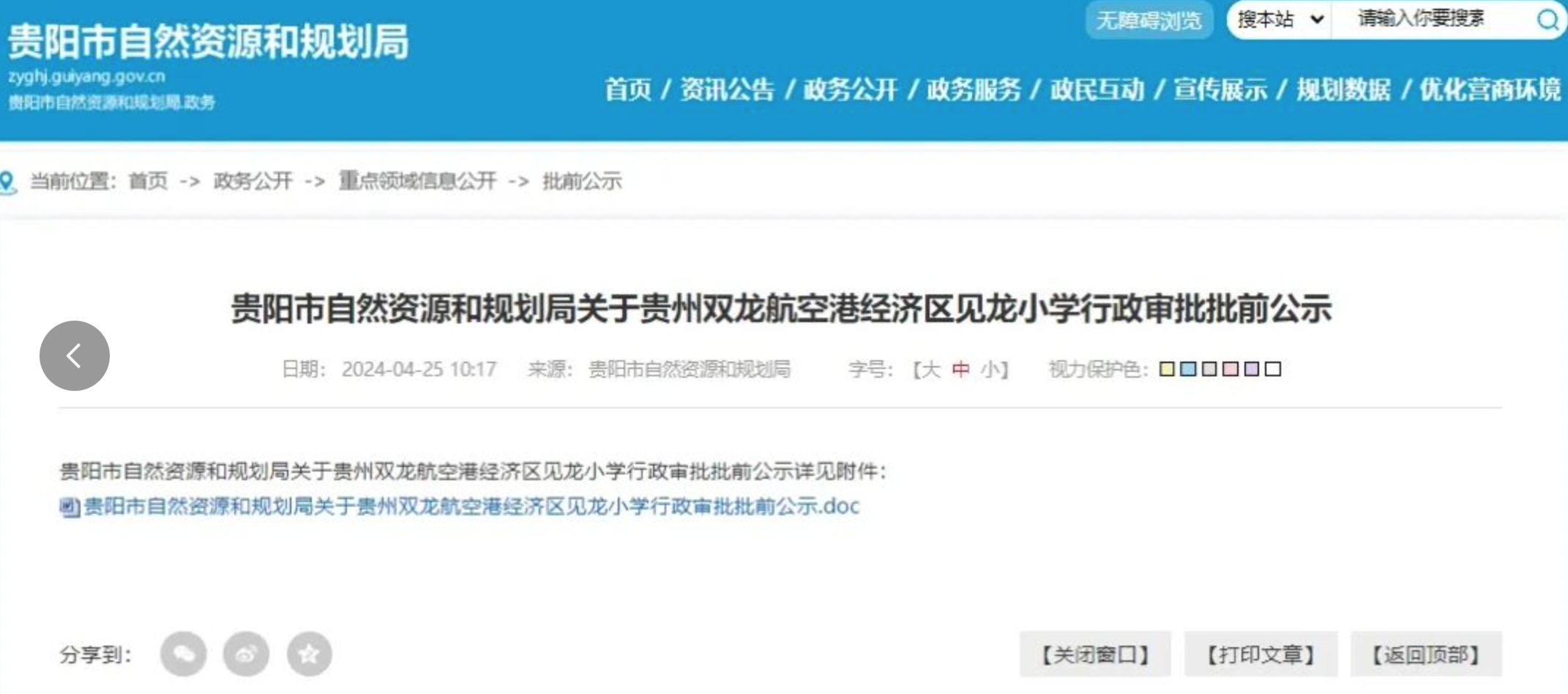 4月25日,贵阳市自然资源和规划局发布关于贵州双龙航空港经济区见龙小学/见龙中学行政审批批前公示,二者申报单位皆为贵州双龙航空港经济区管理委员会,申报类别建设工程规划许可证审查。