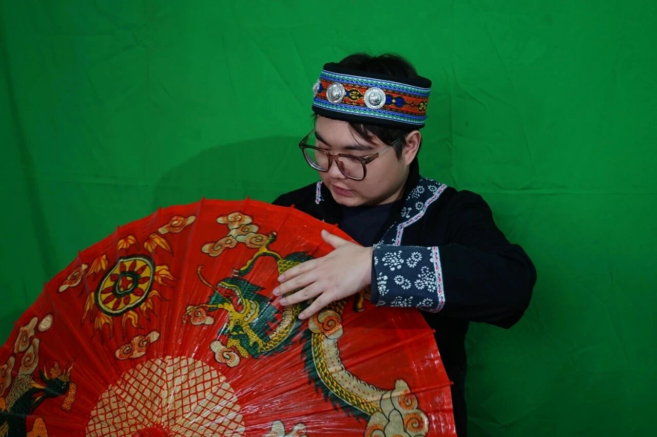 随着“国潮”兴起,油纸伞从婚庆市场走向文创领域。在张朝全的影响下,儿子张泗峻作为无锡工艺职业技术学院视觉传达设计23级的学生,正以年轻视角推动非遗现代化。他依托学校中华优秀传统文化传承基地,汲取设计灵感,将视觉传达理念融入油纸伞制作。他大胆创新,把南京云锦、南通蓝印花布、苏州苏绣、印江的人文地理等多种非遗元素融入油纸伞面,打造出极具特色的产品。