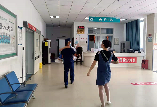 因学校操场位于校园最里面,救护车赶来也需要时间,此时女生因呼吸困难发出痛苦的呼叫声,指挥员立即让驾驶员启动车辆,其他消防员协助将该女生抬上消防车,随后拉动警笛,将生病女生送往附近的德江县中医院。