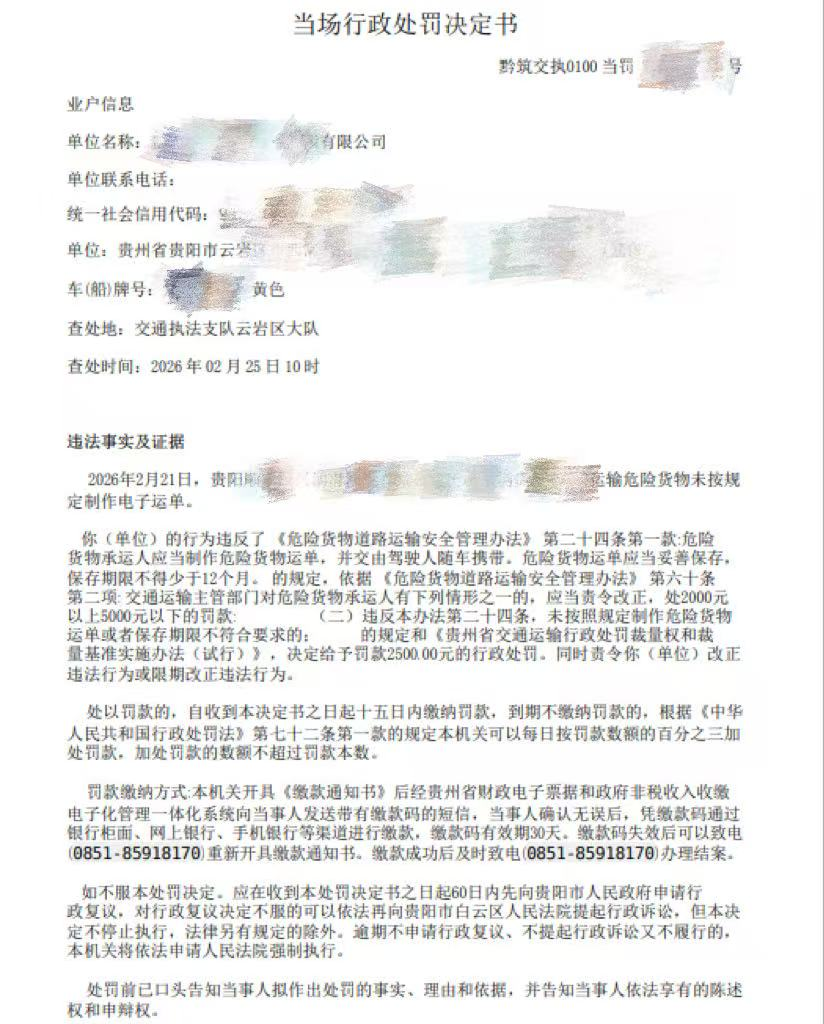 “处罚不是目的,安全才是底线。”云岩区大队相关负责同志向企业负责人强调,危险货物运输具有高危属性,任何环节的疏忽都可能酿成不可挽回的后果。危险货物运单缺失,一旦运输途中发生泄漏、碰撞等意外,救援人员无法第一时间掌握货物特性和处置方法,后果不堪设想。