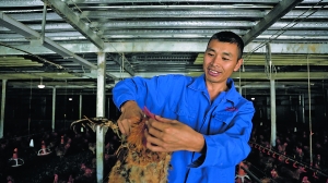 佟安良是负责9号鸡舍的养殖户,今年5月和公司合作,6月6日进了第一批2万多只鸡苗。“鸡舍有两层,可以养近3万只鸡,我一个人就能管理,踏踏实实干下来,一年可以有10万元左右的收入。”佟安良说。