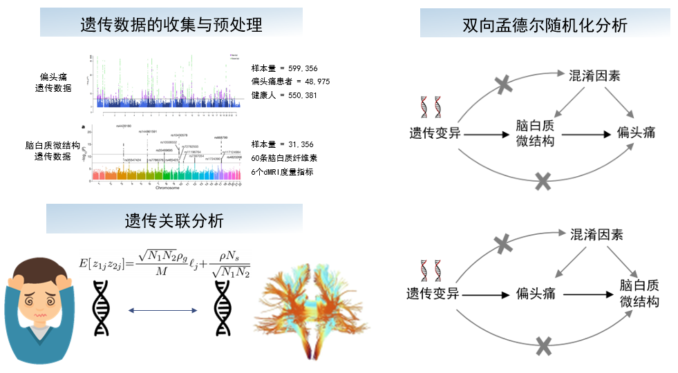 随着神经影像技术的发展,偏头痛的发病机制逐渐从外周血管学说转向中枢机制为主的神经机制学说,迄今已有大量基于神经成像的研究报告了偏头痛患者的脑白质微结构异常,Pashina等人于Lancet期刊发表的文章论述了这一现象,表明脑白质微结构可能是理解偏头痛发病机制的重要切入点。然而,这些研究是建立在观测数据上的相关分析,无法揭示因果关系,即哪些脑白质微结构的改变是偏头痛的病因,而哪些又是偏头痛引发的结果。