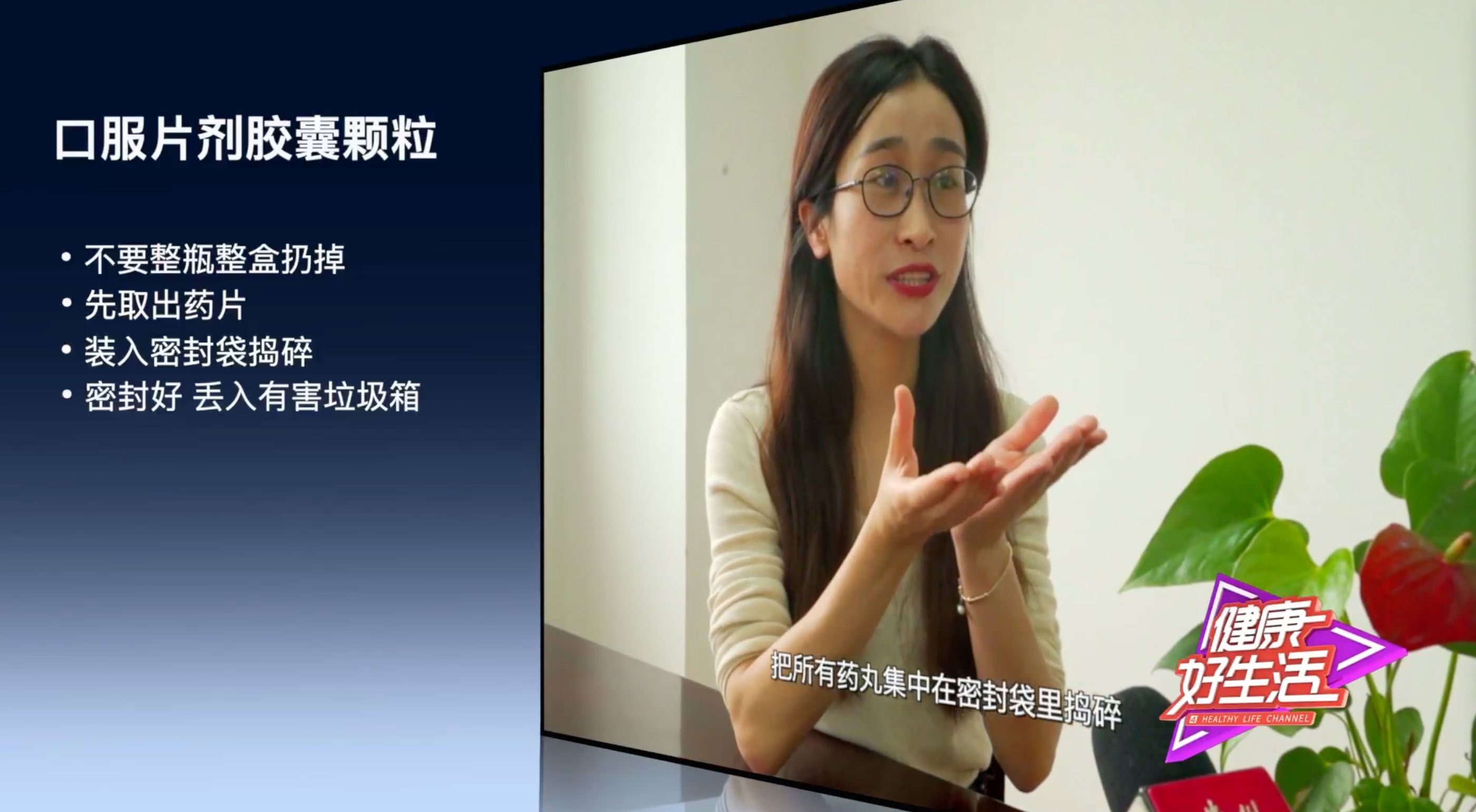 (1)口服片剂、胶囊、颗粒等过期药,不要整瓶或整盒扔掉,应该将剩余药丸从铝箔、药袋等包装中取出,把所有药丸集中在密封袋里捣碎,密封好丢入有害垃圾箱。