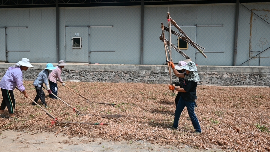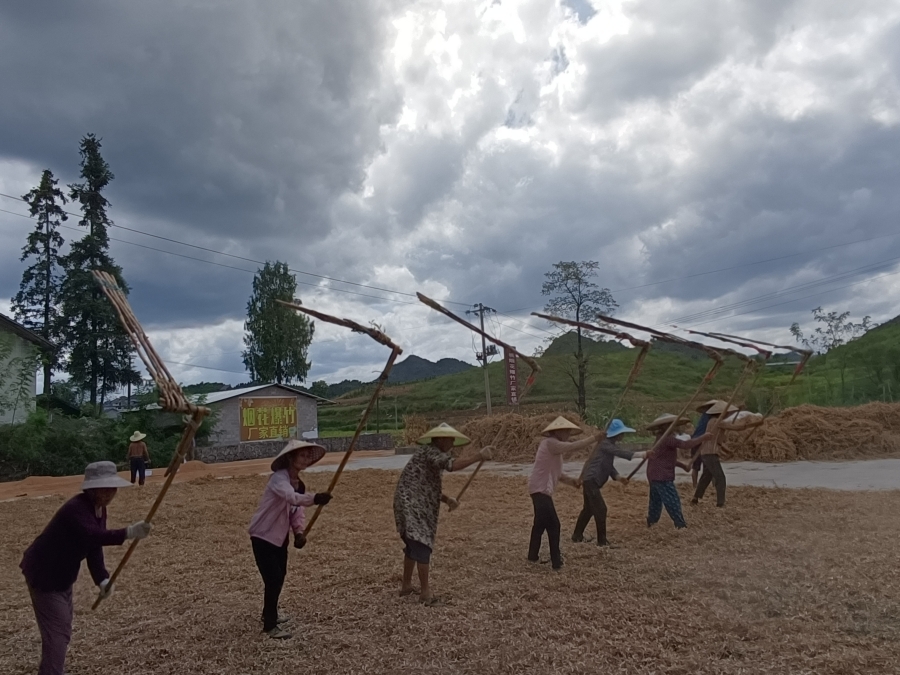 近日,在贵州省岑巩县天马镇白岩坪村大豆晾晒场,10余位村民抢抓时节,顶着烈日翻豆枝、打豆萁,整个大豆脱粒过程忙而不乱、井然有序,富有节奏的镰盖敲打声与村民的欢笑声相互交织,场面十分热闹。