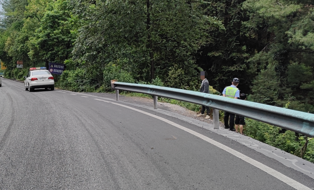 民警抵达事故现场看见,一名男子站在车道护栏外,而事故车辆却不见踪影。上前询问男子得知,他就是驾驶人,事故车辆已坠下数米之下的树林间。