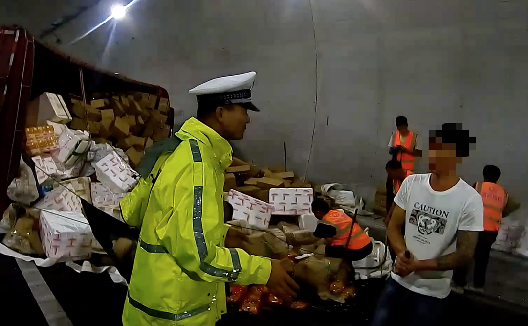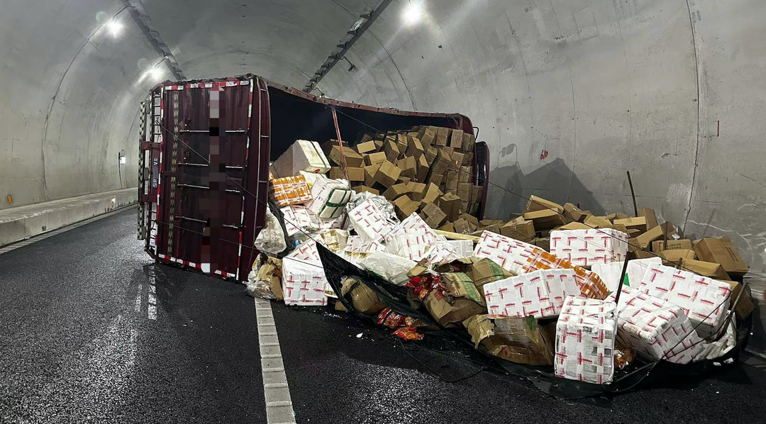 一辆红色轻型仓栅式货车横向侧翻在玉新高速环边坡隧道内,车内箱装货物散落一地。
