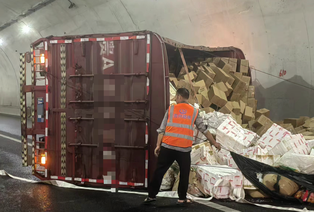 贵州交通广播记者从贵州省公安厅交通管理局获悉。7月18日22时18分许,遵义高速交警三大队接到报警,在玉新高速公路新舟往石阡方向的环边坡隧道内一辆货车发生侧翻,道路正常通行秩序受阻,请出警。