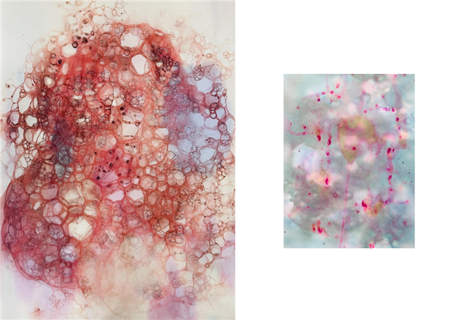 在这冷冰冰的形状中间,我选择了一种红色的墨水,像云一样晕染。形式上的冷和内容上的热互相冲突,产生了让人被刺痛的感觉。