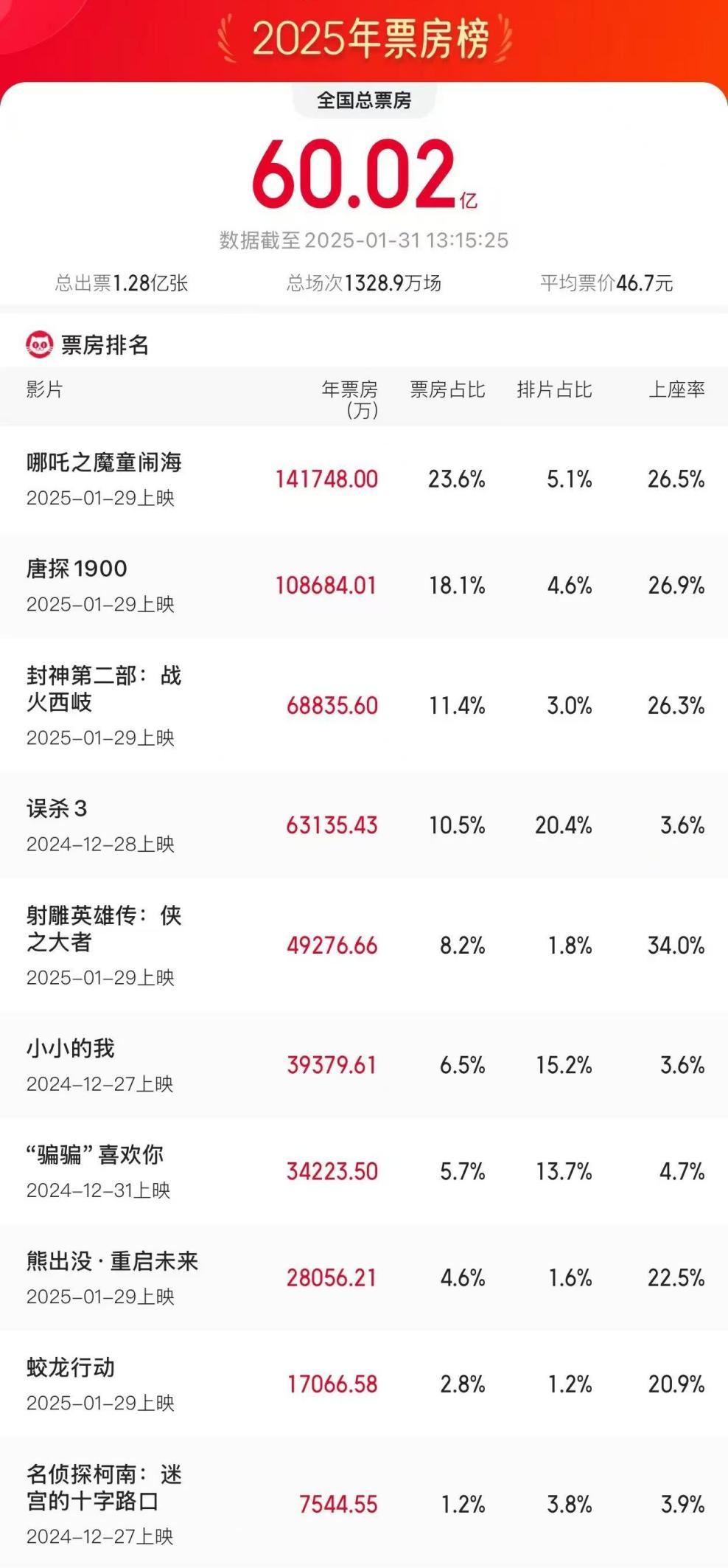 今年大年初一,《封神第二部:战火西岐》《哪吒之魔童闹海》《唐探1900》《蛟龙行动》《熊出没·重启未来》《射雕英雄传:侠之大者》六部国产新片集中上映,截止2025年1月31日13时15分2025年度电影票房(含预售实时)破60亿!
