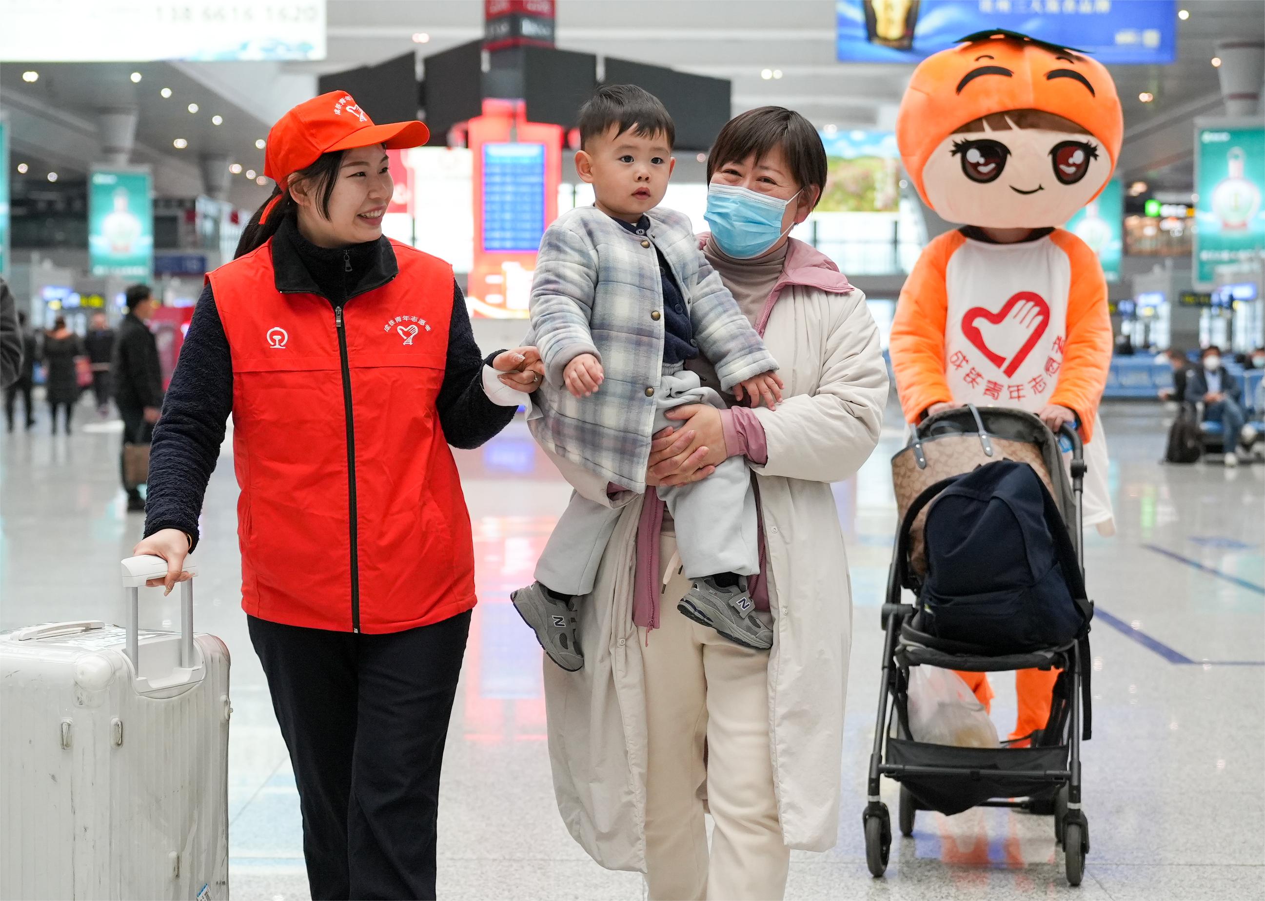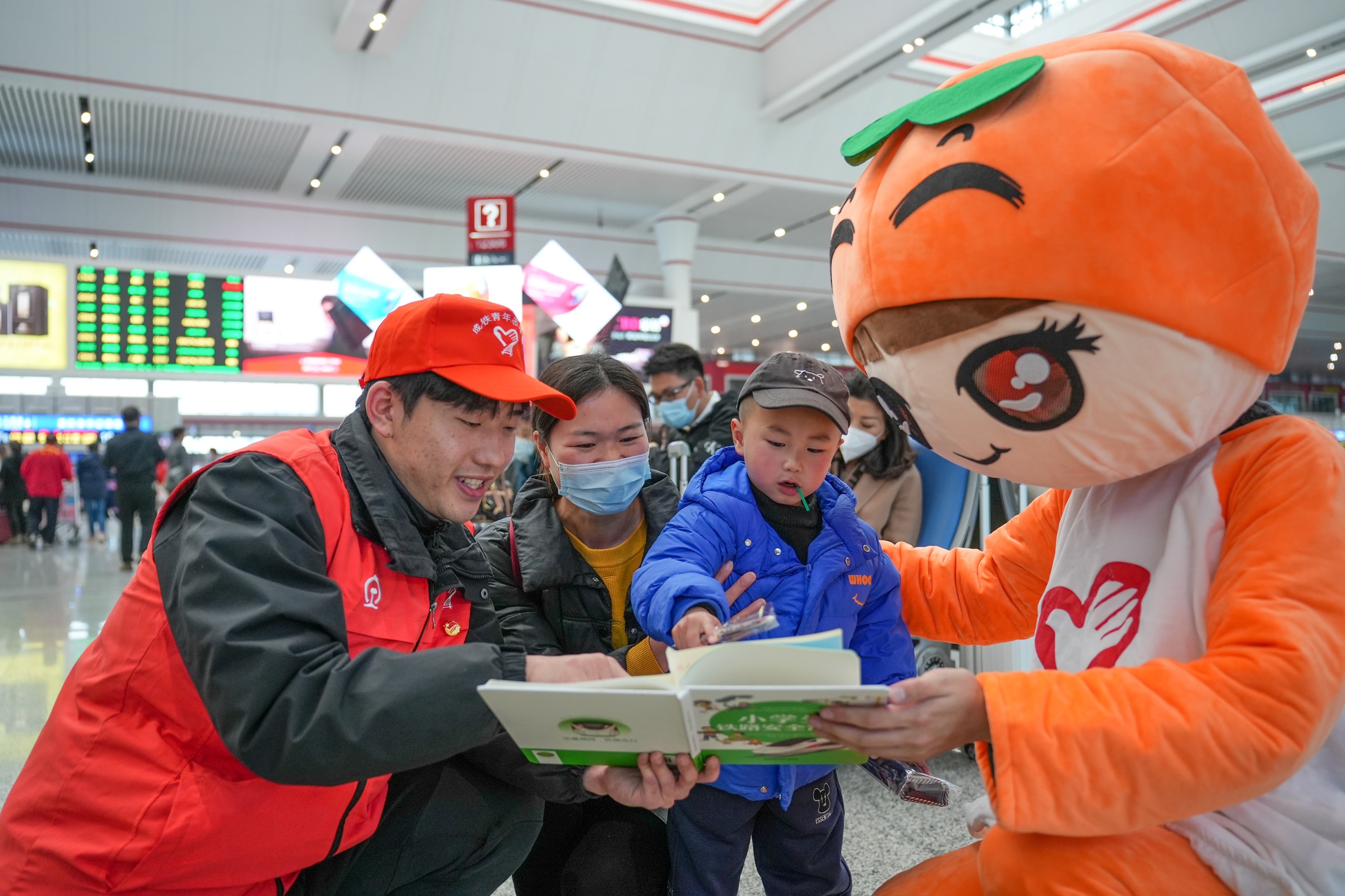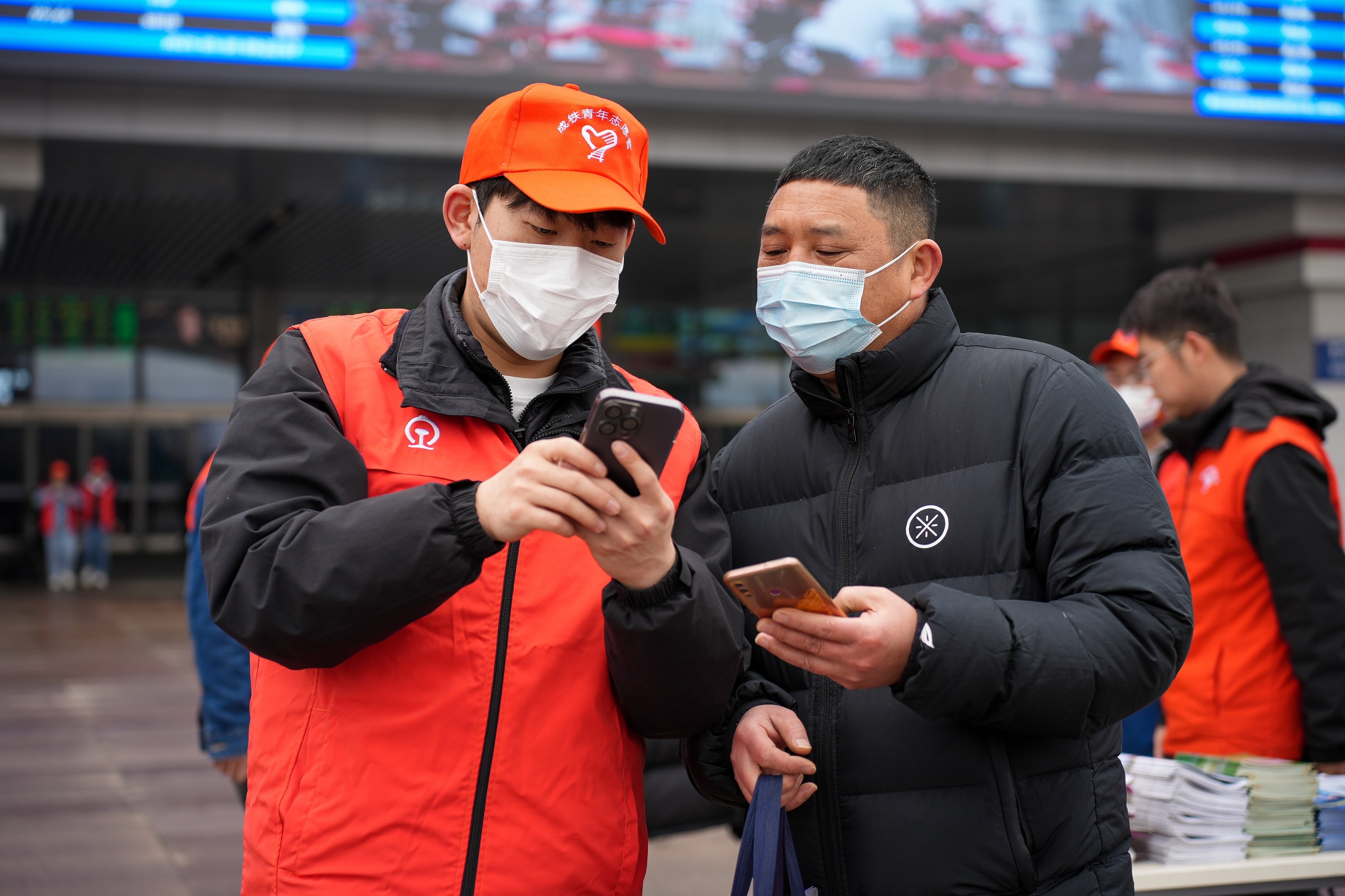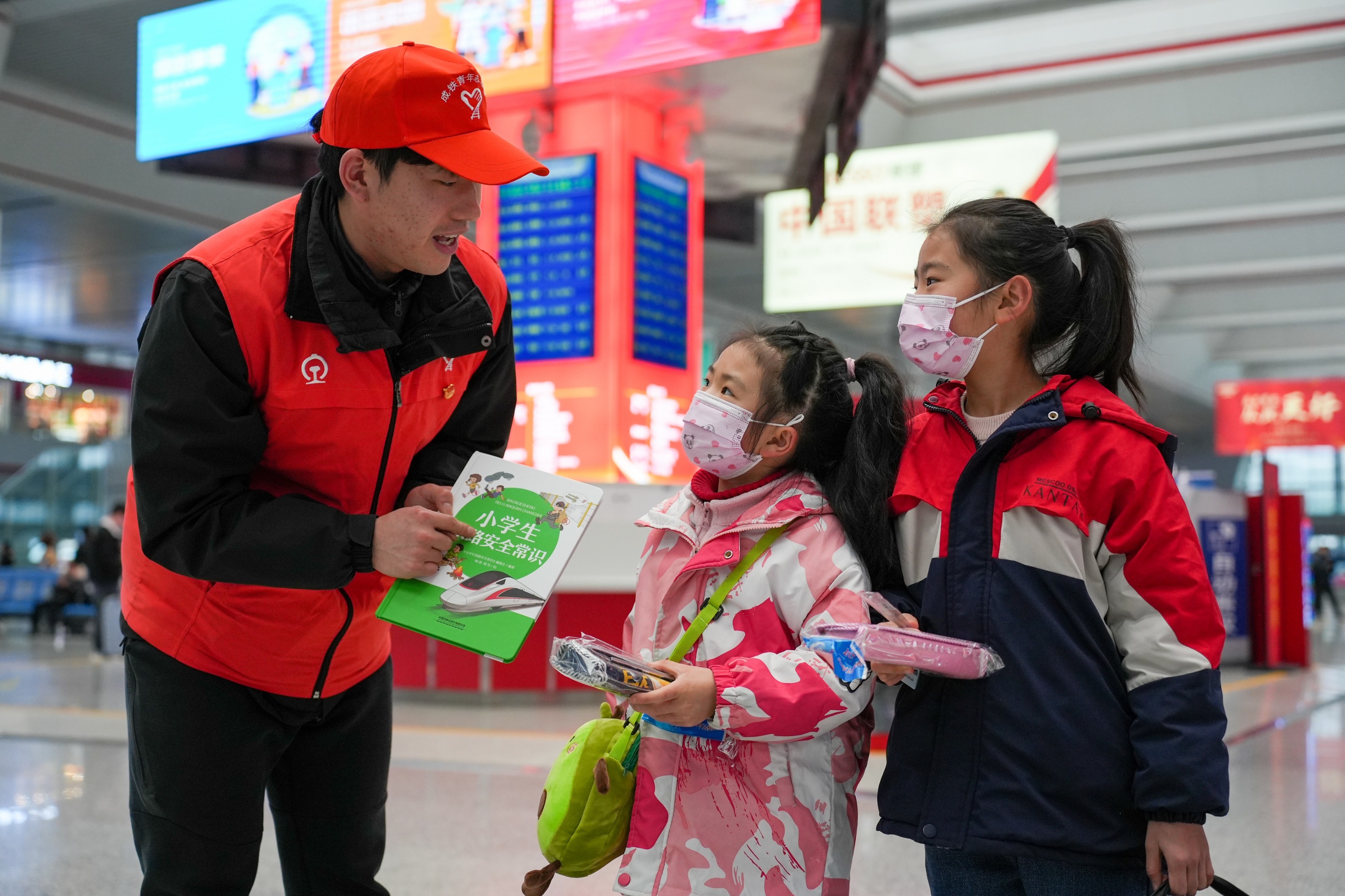 志愿者们一边向旅客宣传安全知识,一边主动做好重点旅客帮扶。凯里工务段危功博和贵阳电务段毛议樯在候车室巡视时,看到行动不便的老爷爷立即上前,为老爷爷推行李并护送上车。