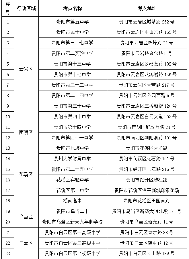 2023年贵阳市高职(专科)分类考试将于本周六(3月4日)上午09:00—11:30进行,全市共有26286名考生参考,全市共31个考点、886个考场,涉及辖区有云岩区、南明区、乌当区、经开区、白云区、花溪区、观山湖区、清镇市、修文县、开阳县、息烽县。届时大量考生前往各考点参加考试,考试开始前、结束后各考点周边路段预计会发生短时高峰流,同时,为了腾空考点,某些原本周六放学的学校预计会提前到周五下午放学,周五晚高峰考点周边的道路预计会出现交通缓行甚至拥堵的情况,交通拥堵延误较平时预计会增加,请广大考生、广大市民提前悉知考点周边道路的通行情况,提前规划出行路线。