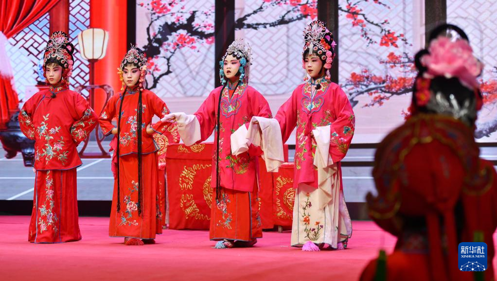 8月28日,在河北省青县“哈哈腔”传承示范基地,小学员表演“哈哈腔”《游花园》选段。