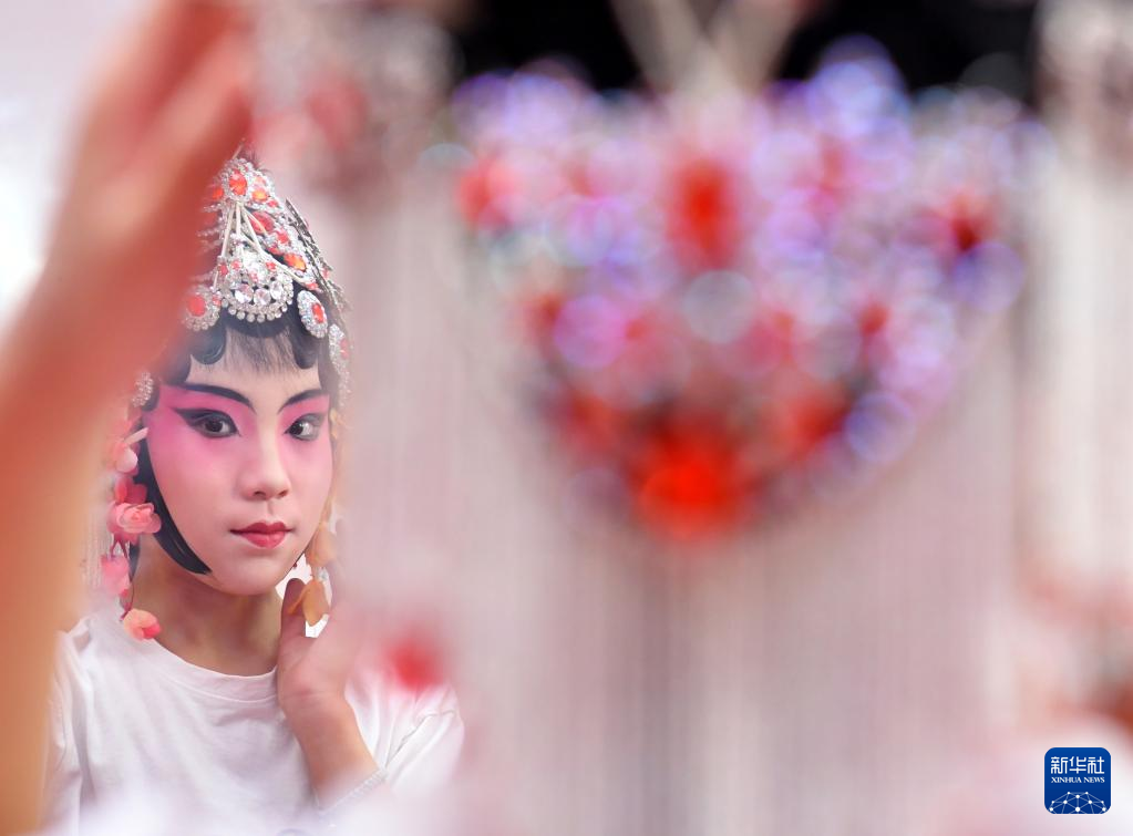 8月28日,在河北省青县“哈哈腔”传承示范基地,小学员在对着镜子整理妆容。