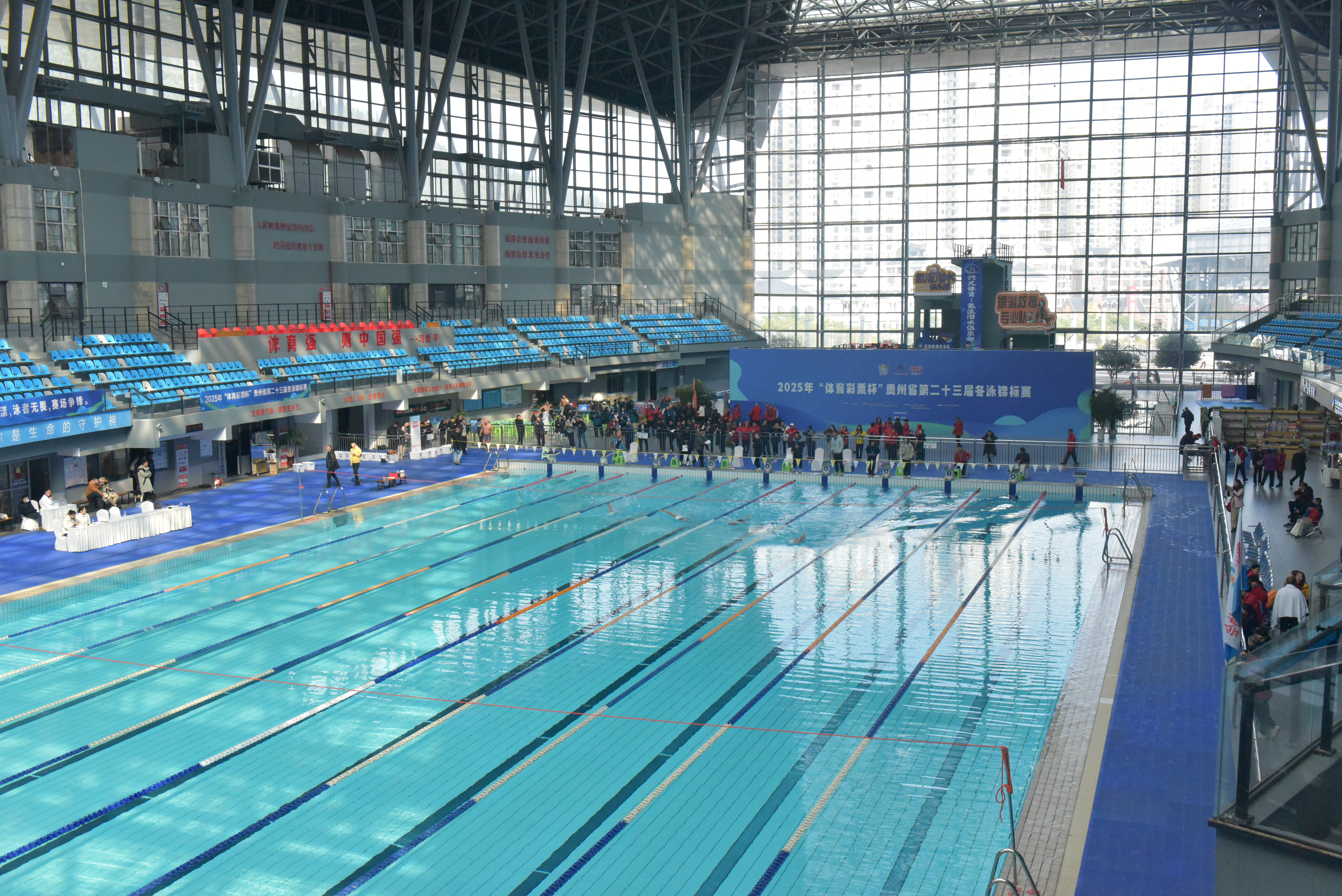 12月6至7日,2025年“体育彩票杯”贵州省第二十三届冬泳锦标赛在兴义市体育中心游泳馆火热开赛。来自全省各地的19支代表队、300余名冬泳爱好者共赴这场“泳”者无畏的竞技盛宴,在劈波斩浪中尽情领略冬泳赛事的独特魅力。