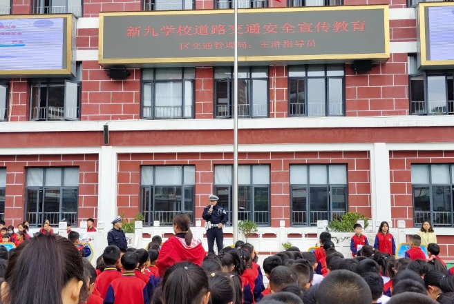 近日,贵阳交警乌当区分局组织警力深入辖区新九学校,利用课间操时段为全校2300余名师生开展交通安全宣传。