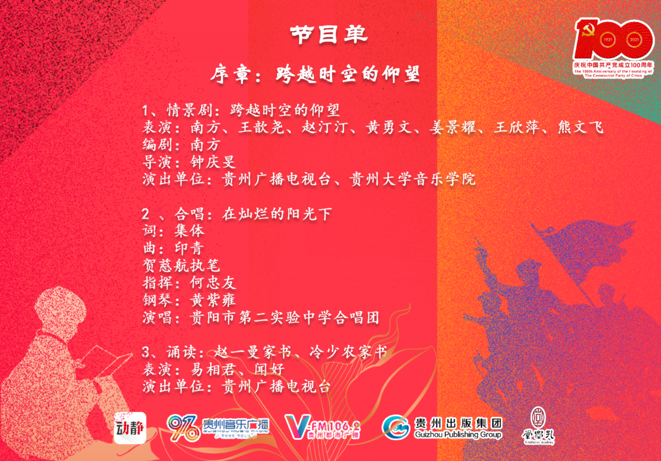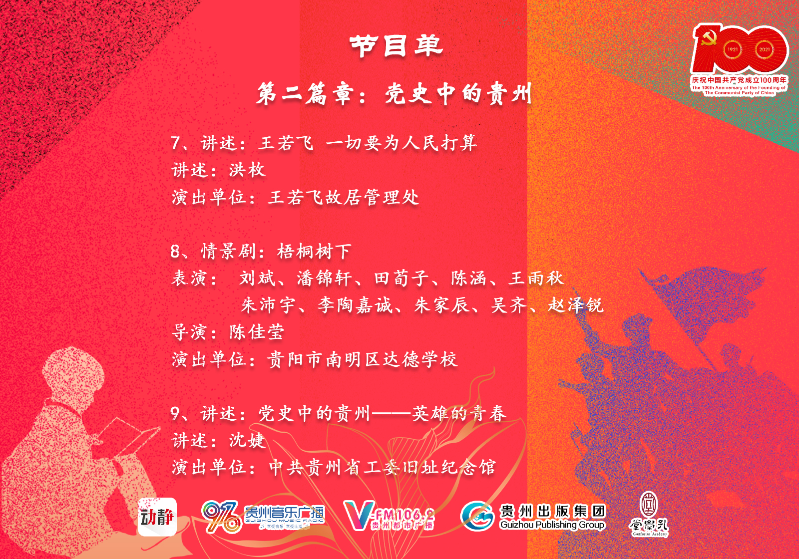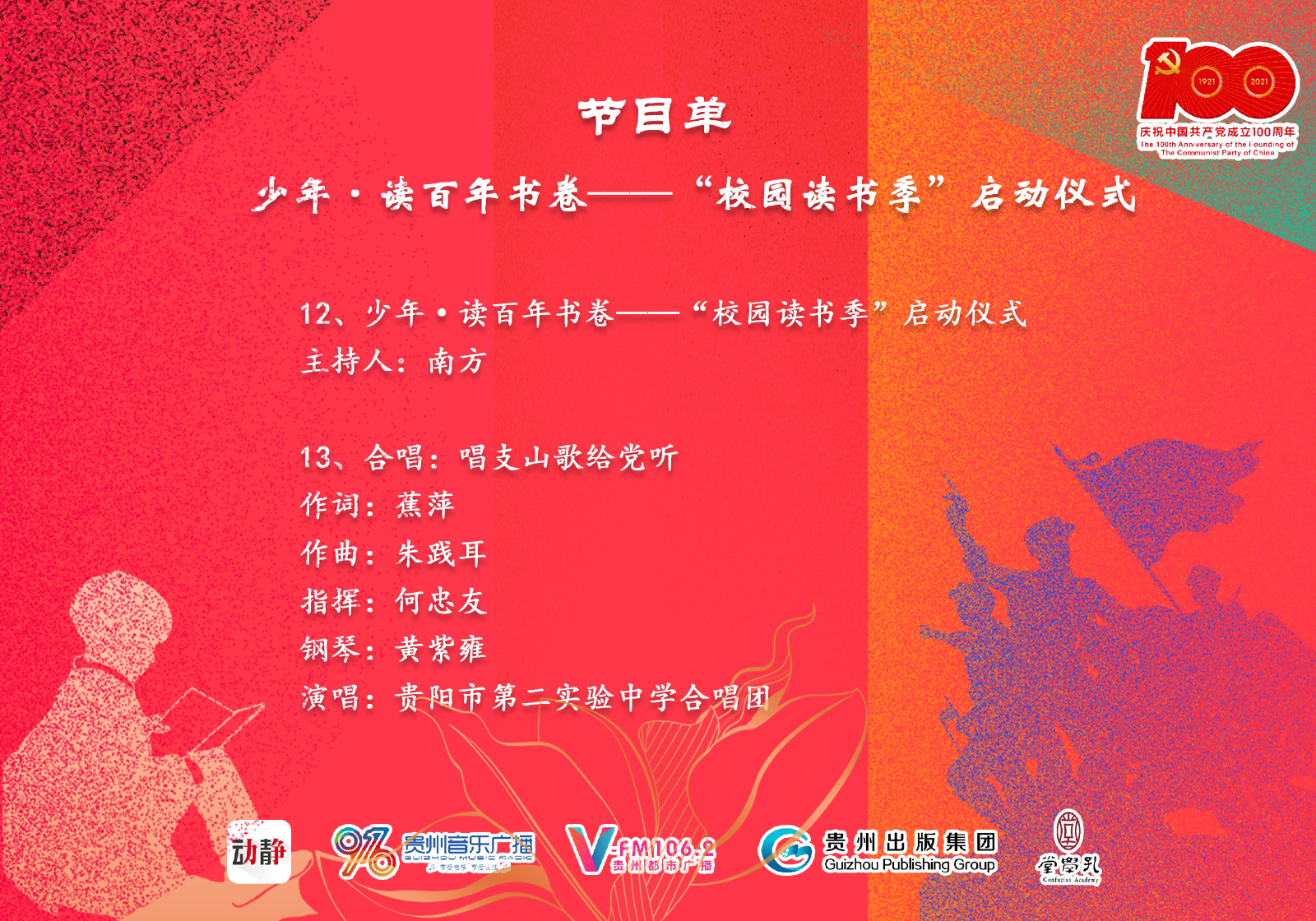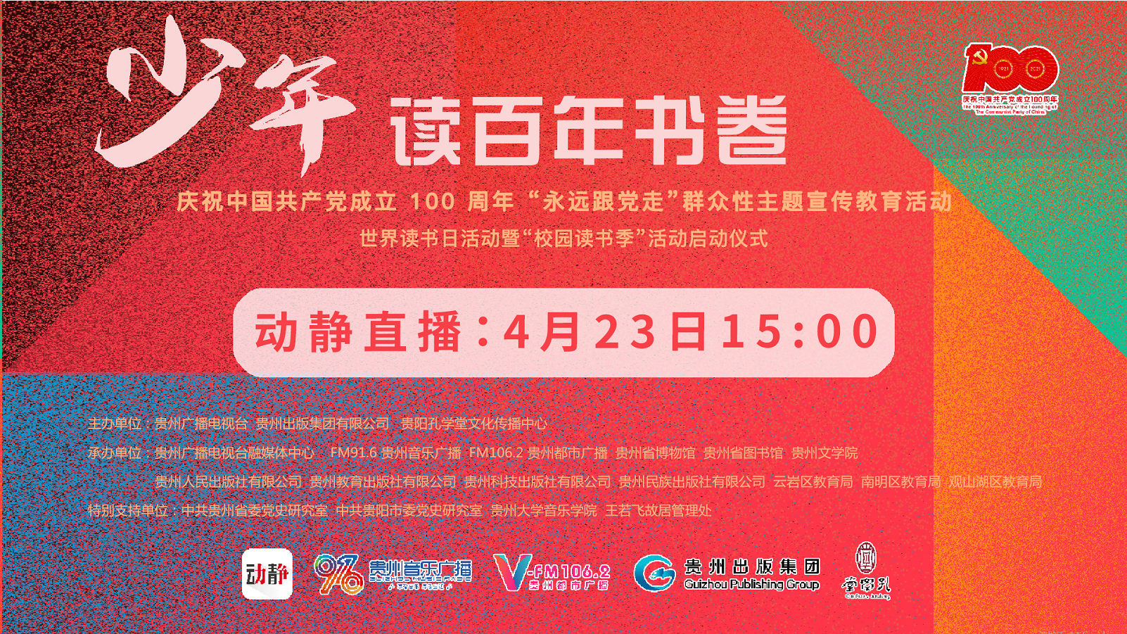 4月23日,世界读书日,由FM106.2贵州广播电视台都市广播、FM91.6贵州广播电视台音乐广播、贵阳孔学堂文化传播中心、贵州广播电视台融媒体中心联合推出的庆祝中国共产党成立100周年“永远跟党走”群众性主题宣传教育活动——“少年•读百年书卷”世界读书日活动暨“校园读书季”活动启动仪式,将于15:00在贵阳孔学堂文化传播中心举办。