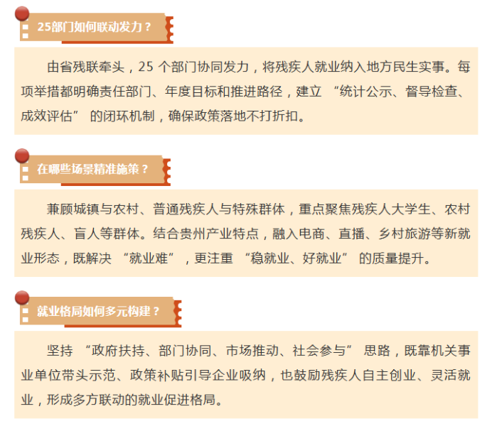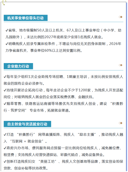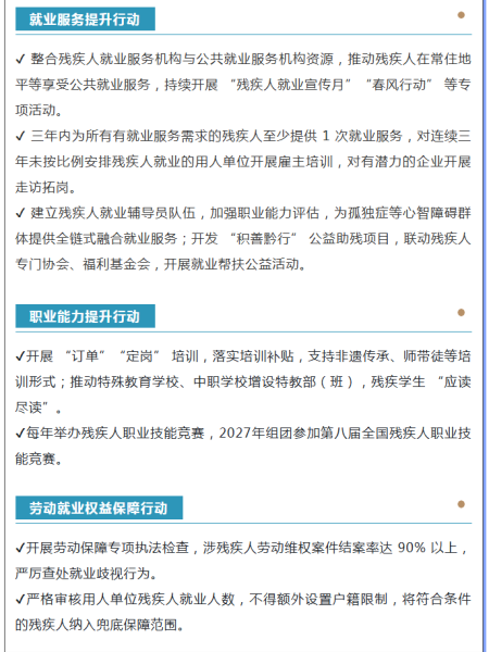 近日,贵州省残联联合省委组织部、省人力资源社会保障厅等25个部门印发《贵州省贯彻落实国务院办公厅<促进残疾人就业三年行动方案(2025—2027年)>责任分工清单》,进一步拓宽残疾人就业渠道,优化就业结构,保障残疾人就业权益,推动残疾人就业创业服务提质增效,促进城乡残疾人实现较为充分较高质量就业。