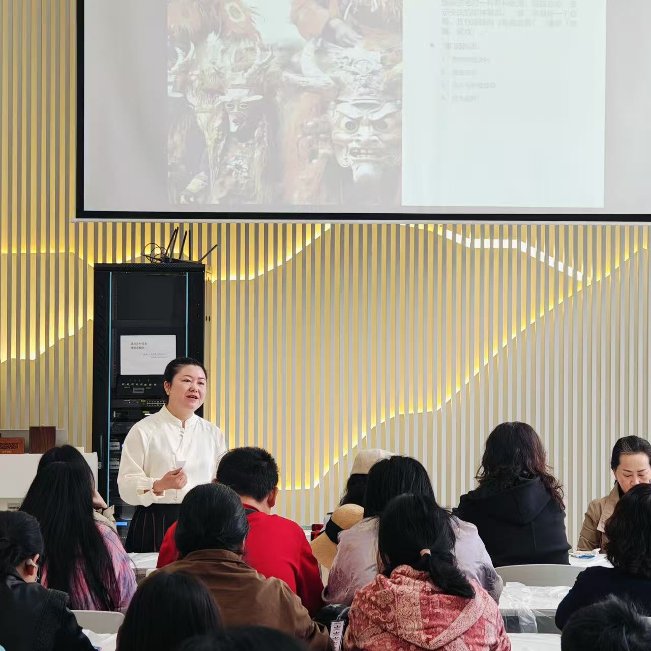 活动伊始,参与者有序到场签到,现场氛围静谧而期待。随后,非遗文化老师登场,从“傩”的本源讲起,结合“人有难,方有傩”的古老寓意,生动拆解傩文化的核心内涵——作为傩戏、傩祭的核心载体,傩面具集雕刻、彩绘、民俗信仰于一体,是贵州极具特色的非遗瑰宝。老师重点介绍了德江傩面具(2007年入选贵州省非物质文化遗产)与仡佬族傩戏(国家级非物质文化遗产)的独特价值,一凿一刻间的匠人智慧、少数民族古老信仰的隐秘脉络,让在场读者对傩文化有了深刻认知。讲解结束后,老师为每位参与者发放木雕体验材料包,正式开启手工创作环节。