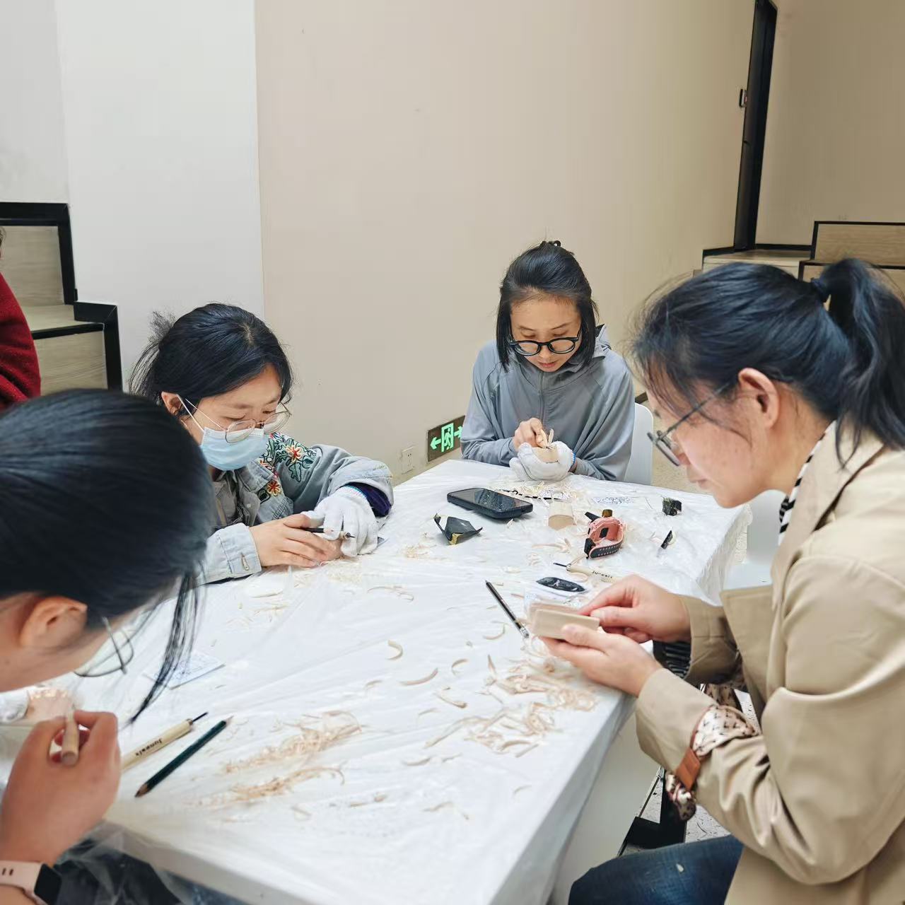 动手体验阶段,现场专注而不失秩序。老师耐心示范基础雕刻手法,从线条勾勒到深浅雕琢,每一个动作都细致拆解。参与者们专注凝神,手持刻刀小心翼翼操作,或凝神构思图案,或精准刻画纹理,偶有轻声交流雕刻心得,更多的是在沉静中感受刀木之间的匠心流转。原木在刻刀下逐渐成型,一张张独具特色的木雕傧面慢慢诞生,有的线条粗犷尽显古朴韵味,有的细节精致传递吉祥寓意,每一件作品都承载着参与者对非遗文化的理解与热爱。经过近两小时的创作,大家圆满完成专属傩面作品,眉眼间尽是完成作品的自豪与欣喜。