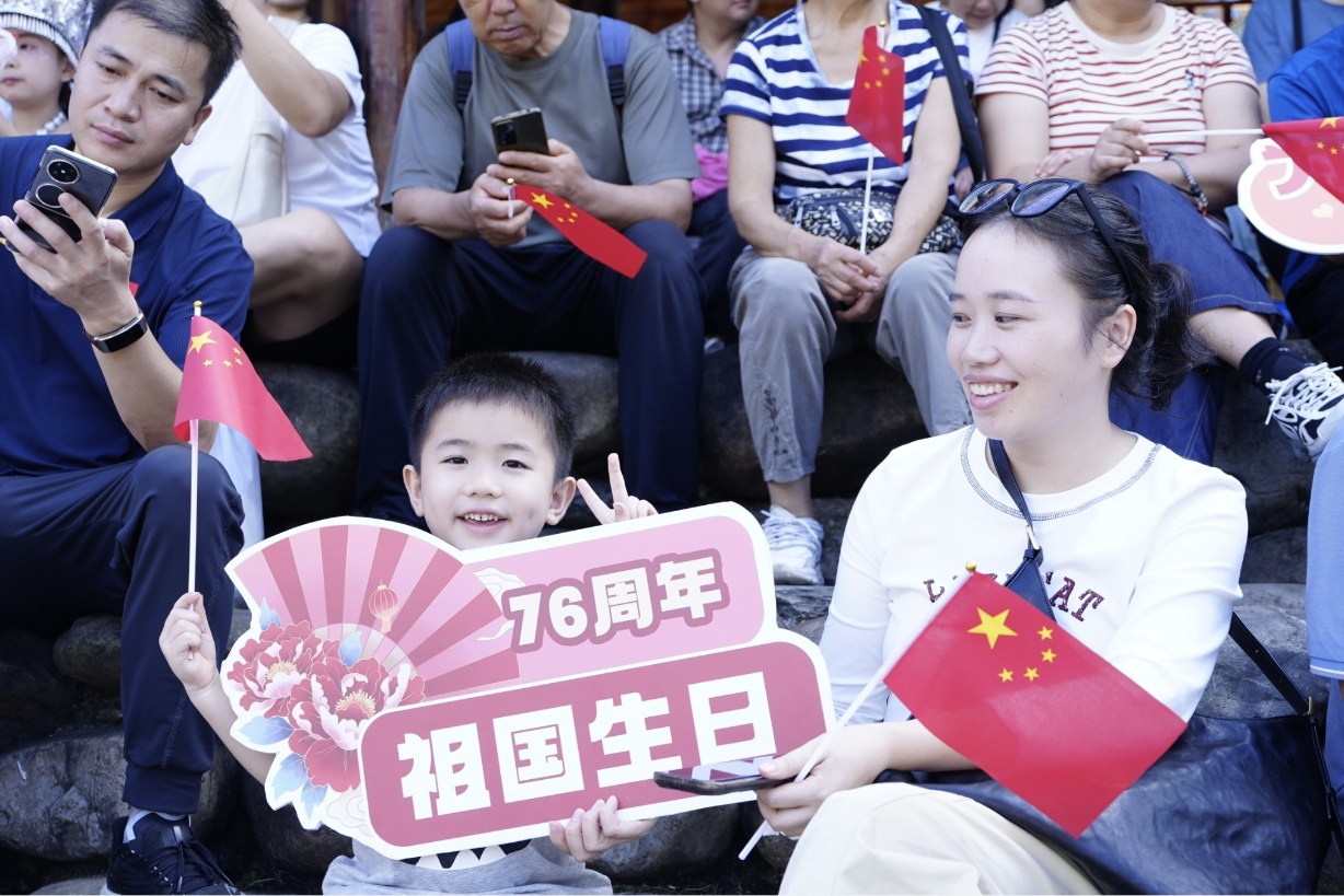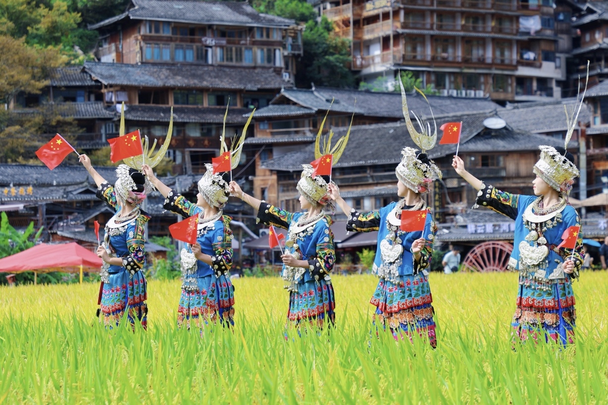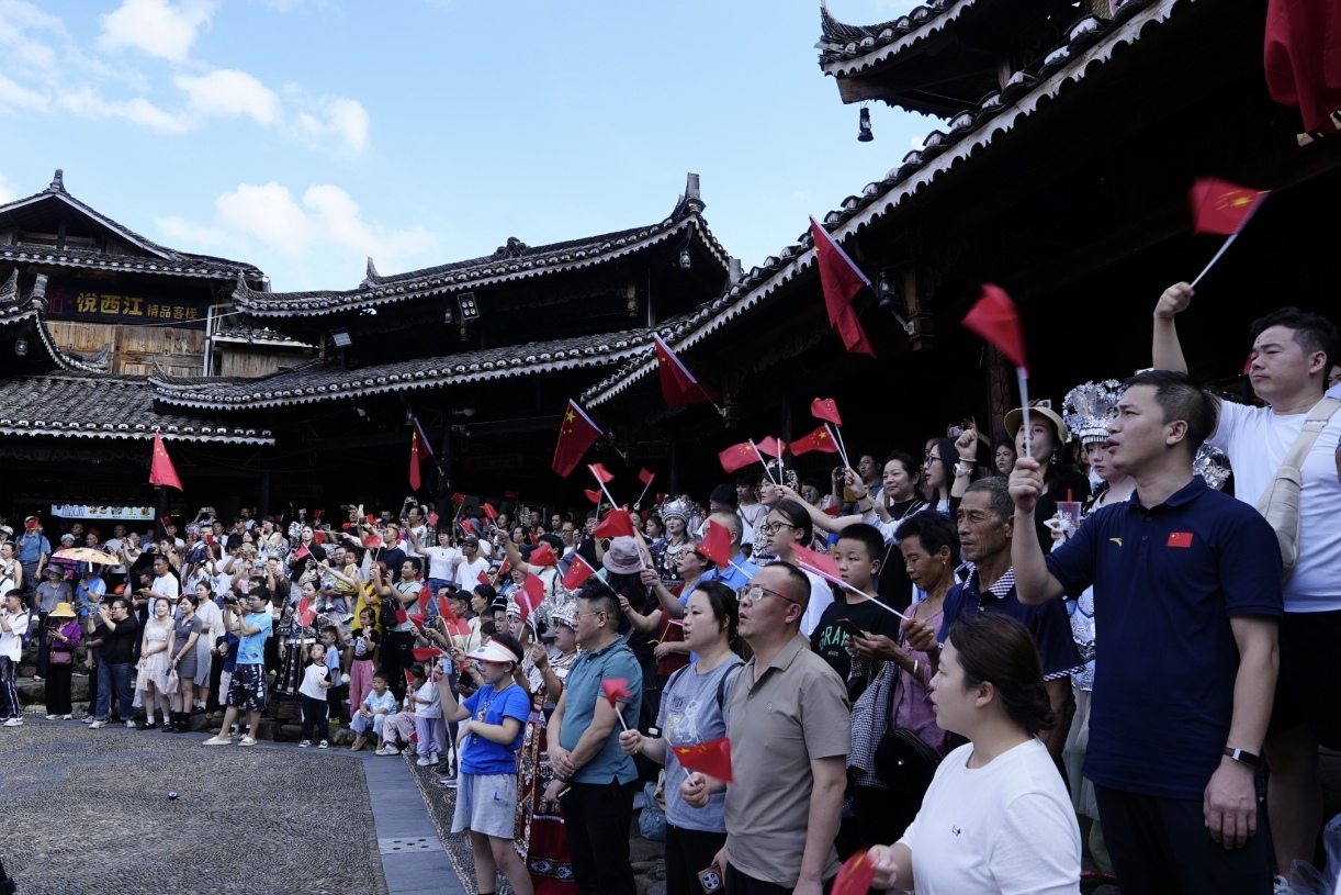 此次“双节”假期,西江千户苗寨景区以民族文化为核心、多元体验为载体,精心策划了“高山流水”、情定西江·讨花带、苗族刺绣蜡染技艺体验、姑妈篮球赛、《苗韵蝶声·美丽西江》、红色合唱“我为祖国唱赞歌”等20余项民俗文化活动。同时,还设置了“我与国旗同框”打卡、喜蛋祈福竞猜等系列互动活动,营造出浓厚的节日氛围。
