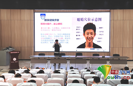 志愿者贾涵讲解眼睛保护操需要按压的穴位。北京中医药大学研支团供图