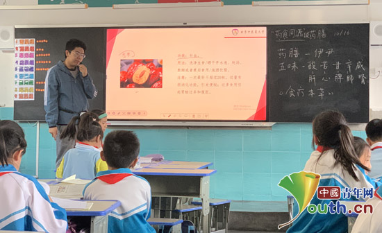 北京中医药大学研支团志愿者针对小学生特点,开展具有趣味性、实践性的中医药文化进校园工作,让学生们在了解中医药、感受中医药、学习中医药、认同中医药的过程中,提升自身中医药健康素养。(记者 李彦龙 通讯员 冉再洋 贾涵)