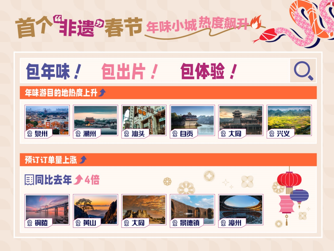 作为“申遗成功”的首个春节假期,打卡非遗体验活动,过个地道的中国年,“年味游”正成为2025春节国内游游客的不二之选。携程数据显示,春节期间,泉州、潮州、汕头、自贡、大同、兴义等小众目的地热度飙升。
