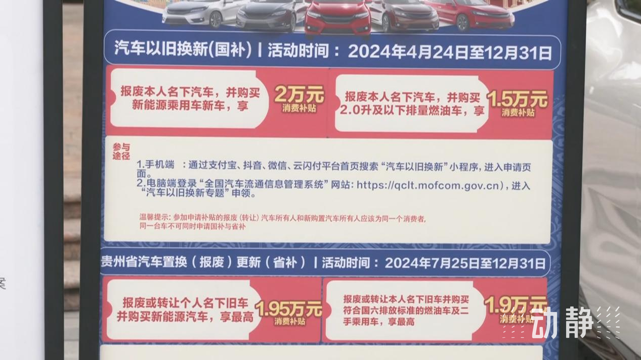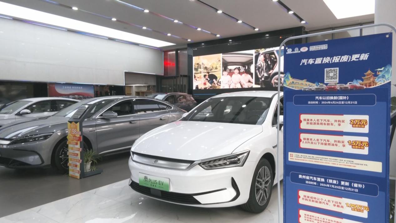 在贵阳这家汽车4S店,店内醒目位置展示了各类优惠政策海报,吸引不少消费者咨询。在“以旧换新”政策与企业优惠活动的双重助力下,该店近期销售额持续增长。
