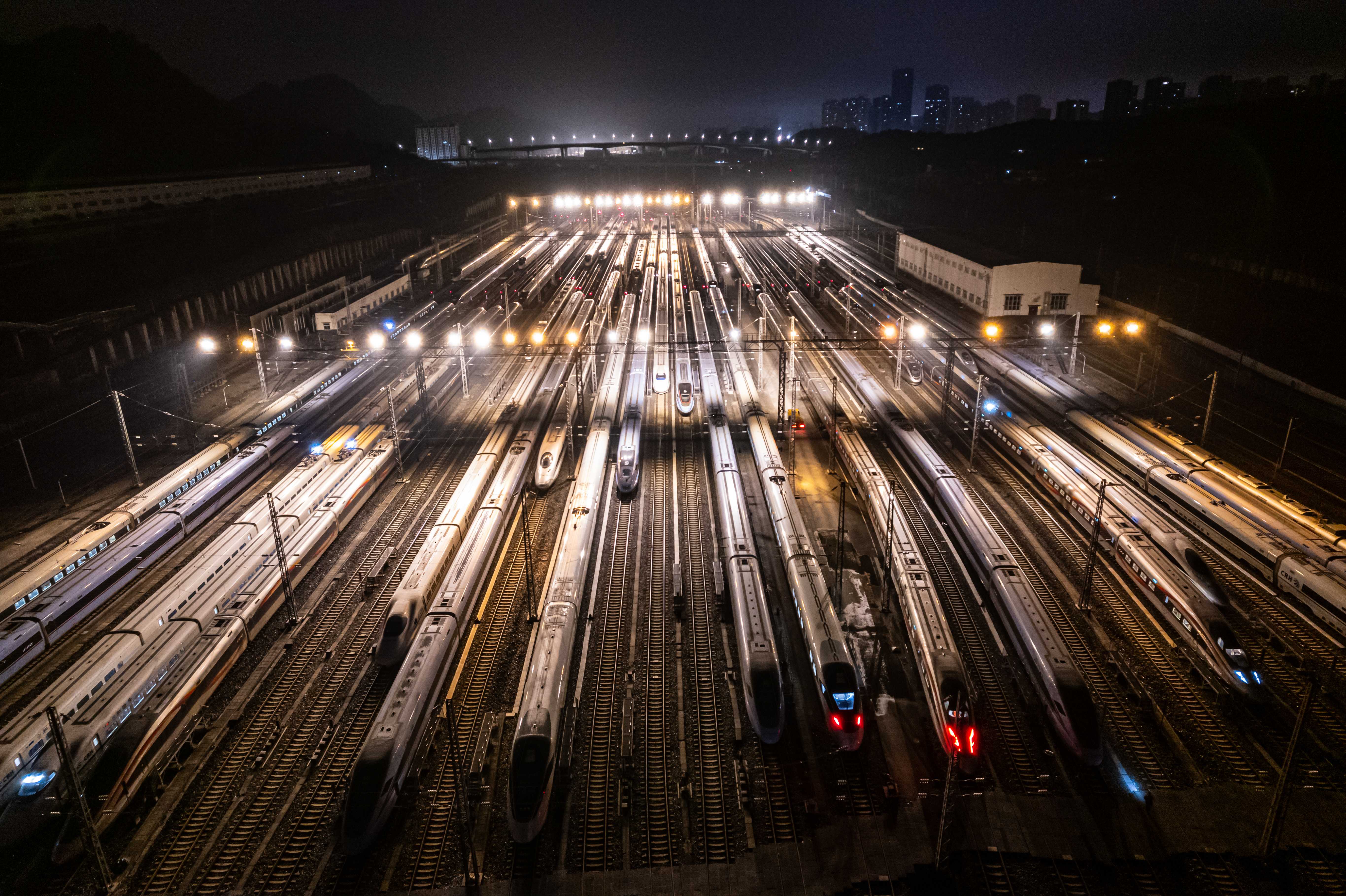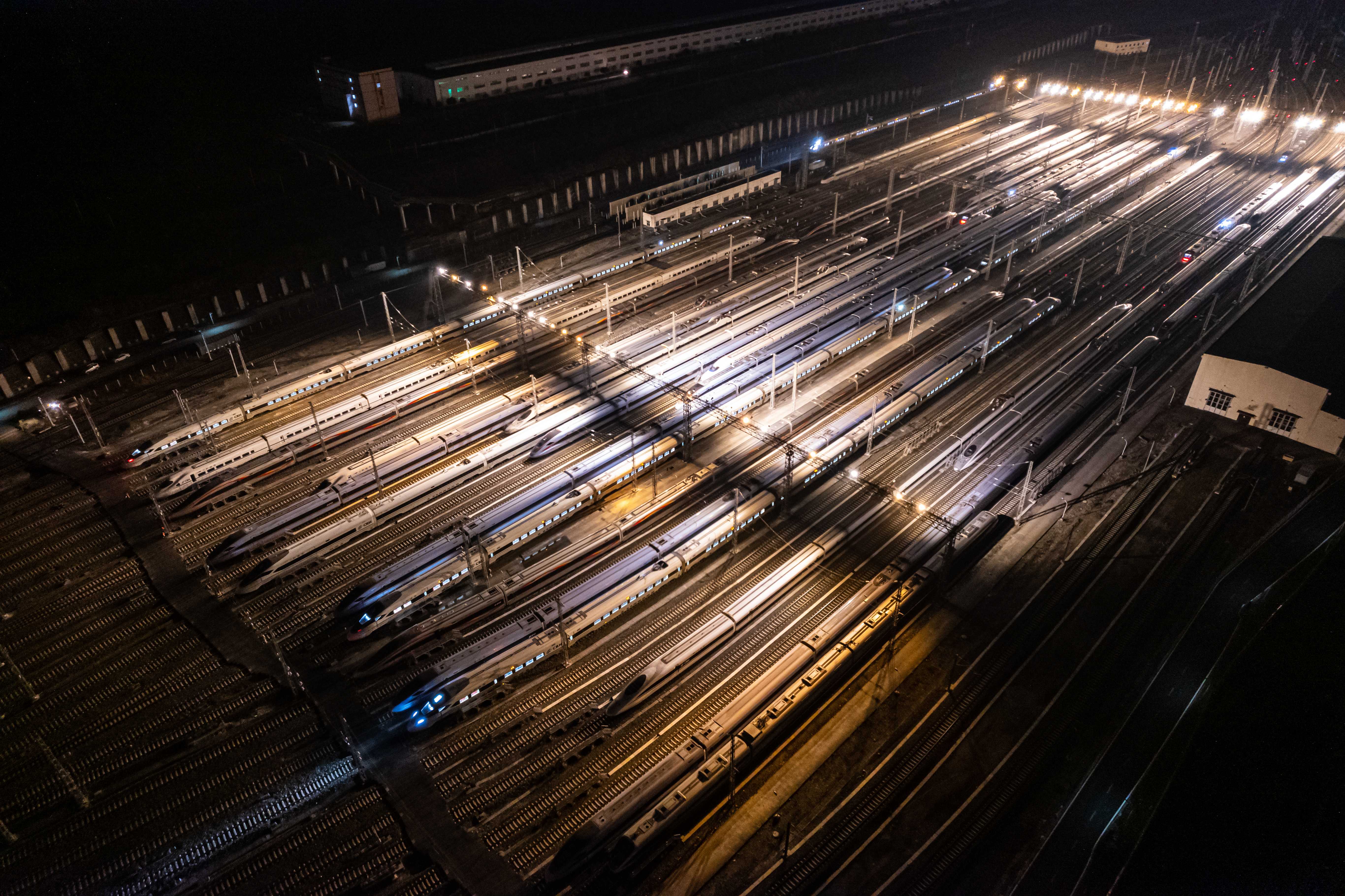 2月2日凌晨3时,贵阳车辆段贵阳北动车运用所内灯火通明,动车组机械师正坚守岗位,对春运首日即将开行的动车组列车开展精检细修。存车场上,一列列动车组整齐列队、蓄势待发,宛如蛰伏的“钢铁巨龙”。从高空俯瞰,这片整装待发的“陆地航母”气势恢宏,即将扬帆起航,正式拉开2026年春运大幕,奏响回家的节拍。