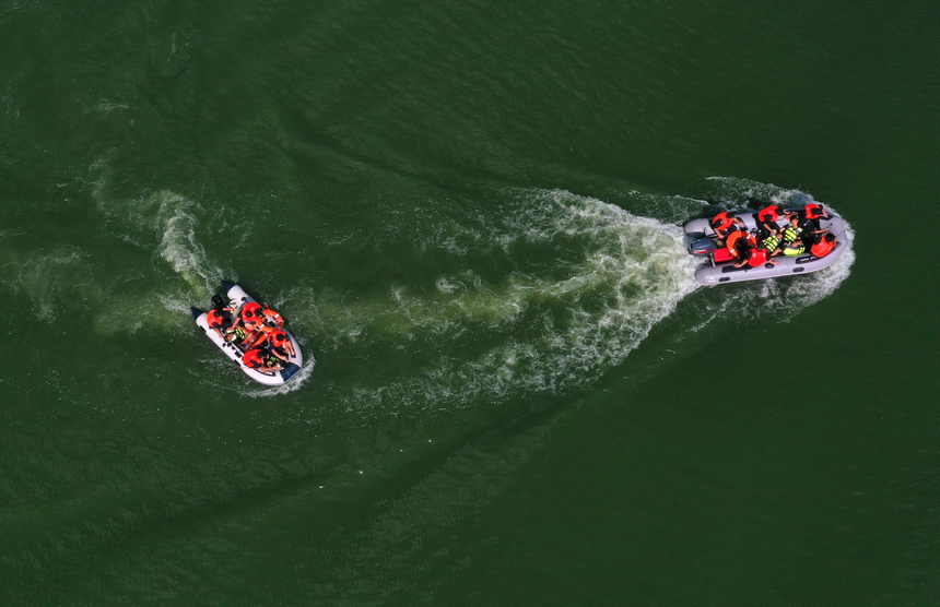 7月14日,在贵州省丹寨县万达小镇景区,演练人员驾驶救生艇对"落水人员"实施紧急救援(无人机照片)。
