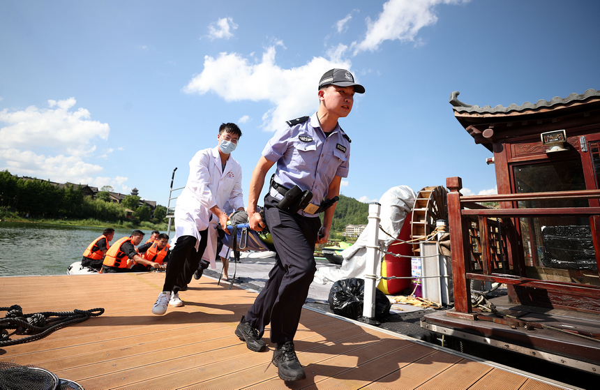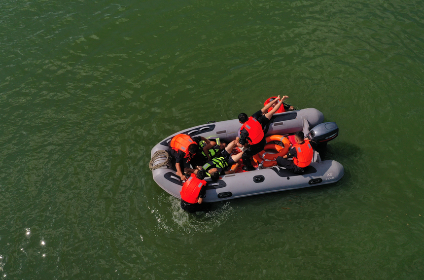 当日,贵州省黔东南苗族侗族自治州丹寨县公安局特巡警大队组织暑期景区水上应急救援演练,对落水人员现场紧急救助和救生艇编队水上紧急救援等科目进行系列模拟演练,旨在提高应对景区暑期水上突发事件的反应速度和救援处置能力。(图/文 黄晓海)