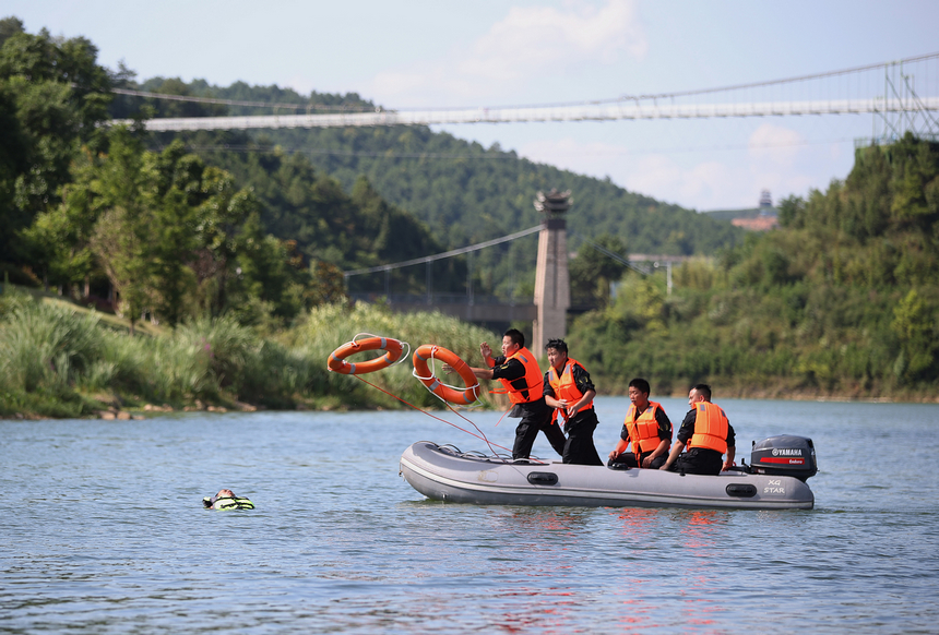7月14日,在贵州省丹寨县万达小镇景区,演练人员对"落水人员"实施安全转移。
