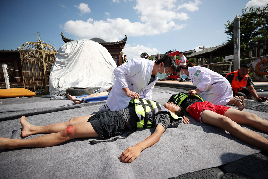 7月14日,在贵州省丹寨县万达小镇景区,演练人员对"落水人员"实施现场紧急救护。