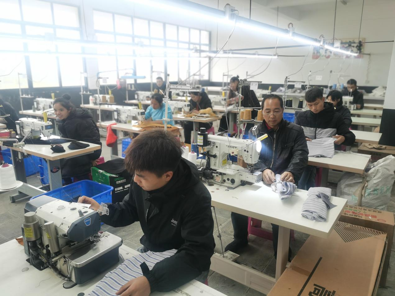 说干就干,筹备办公场地的同时,他还到处寻访手脚灵巧的绣娘。村子周边产业少,缺乏就业机会,大多数年轻人都选择外出务工,村子里都是留守妇女和鳏寡孤独。他便积极发动大家,承诺在“家门口”给家乡的姊妹们提供就业岗位。刚开始,大家对他开制衣厂并不信任,怕赔了工时还挣不到钱。他就一点一点地教会她们技术,经过一年多的努力,队伍规模慢慢地扩展到了现在几十人。在韦万恒的带领下,大家不断尝试创新、吸取经验,对产品工艺改造升级,工厂收益越来越大,工人工资也越来越高。“我们今年最主要是生产贸易产品,包括针织开衫、运动裤、T恤衫等,我们还做少数民族的服饰。”韦万恒说。
