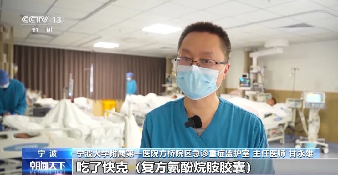 宁波大学附属第一医院方桥院区急诊重症监护室主任医师 甘永雄:吃了快克(复方氨酚烷胺胶囊),就是我们常见的感冒药,还有布洛芬缓释片,这个是退热的,吃了之后效果不好。然后他家里面又给他买了两个药,就是我们中成的感冒药,相当于四个药,吃了以后效果不好,出现了恶心呕吐腹泻。