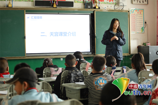 研支团成员闫卓凡在课堂中介绍航天员桂海潮的事迹。北京航空航天大学研支团供图