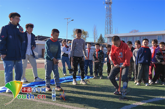 研支团成员指导孩子们发射水火箭。北京航空航天大学研支团供图