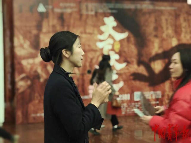 2月23日晚,舞剧《天下大足》在重庆大剧院演出开始前,观众正在咨询购买大足石刻文创产品。中青报·中青网记者 耿学清/摄