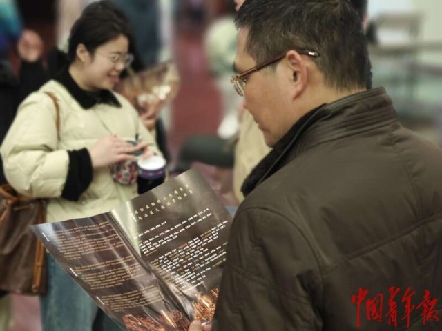 2月23日晚,舞剧《天下大足》在重庆大剧院演出即将开始,一名观众正在认真阅读舞剧资料。中青报·中青网记者 耿学清/摄