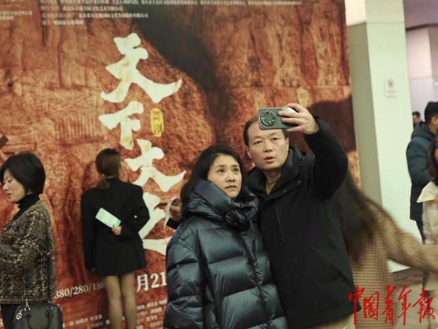2月23日晚,重庆大剧院,舞剧《天下大足》演出开始前,观众在海报展板前合影。中青报·中青网记者 耿学清/摄