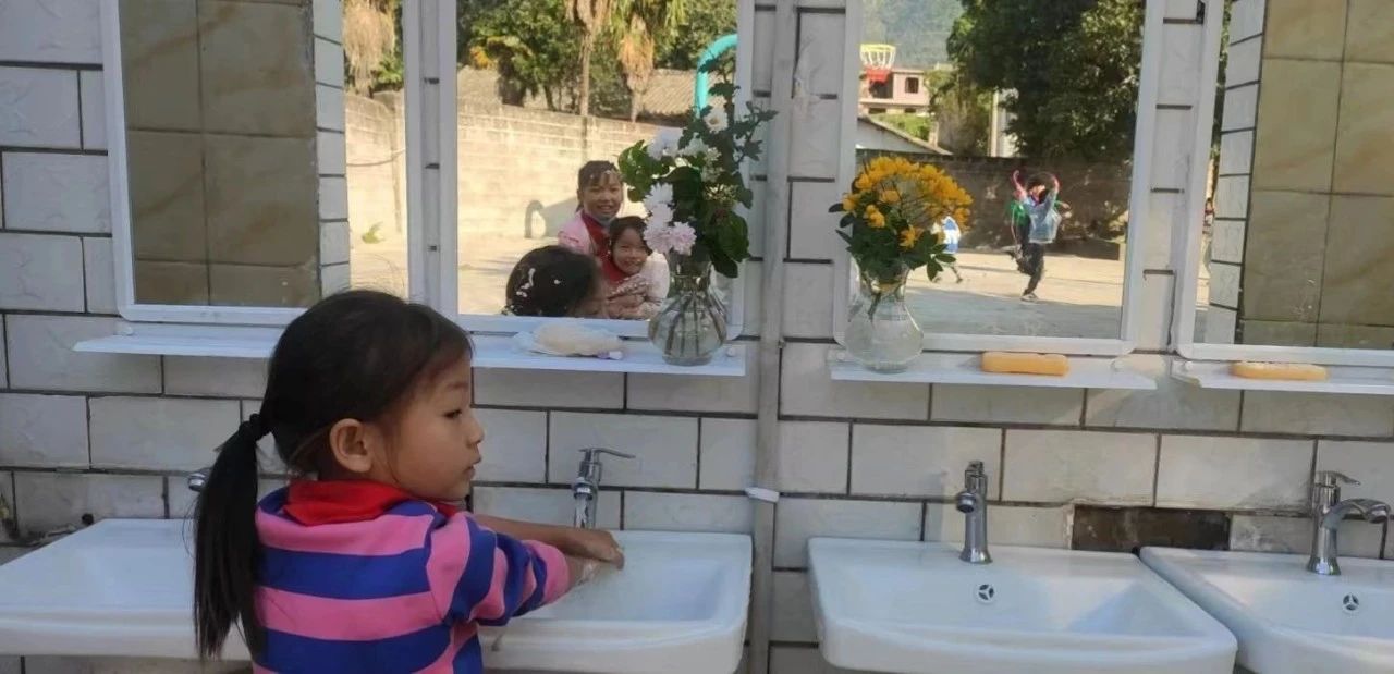 赵红明来到螃蟹小学做的第一件事,是改造厕所。“在洗手间里装了镜子,还放了卫生纸,打扫得干干净净。孩子们每天从家里带花放在厕所里。我们学校可能是附近唯一一个给每个厕所隔间都装了门的小学。”