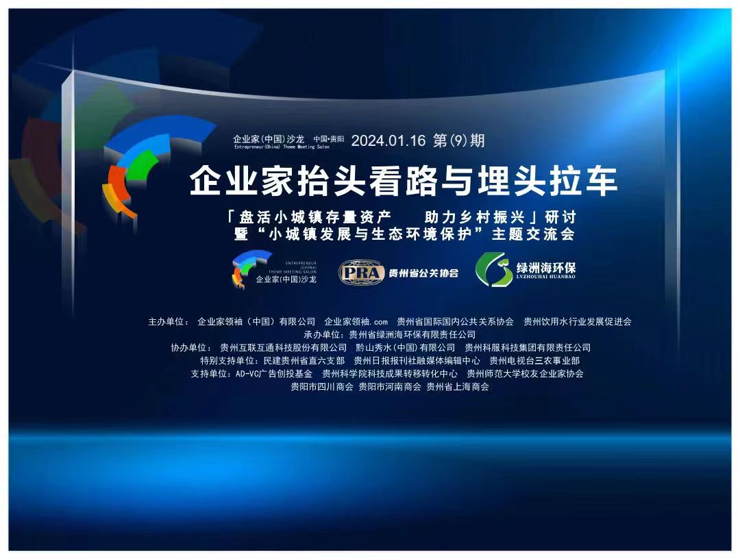 1月16日,由贵州省国际国内公共关系协会、企业家(中国)沙龙、贵州省绿洲海环保科技有限公司联合举办的“企业家抬头看路与埋头拉车暨小城镇发展与生态环境保护”为主题的沙龙交流活动在贵阳举办。