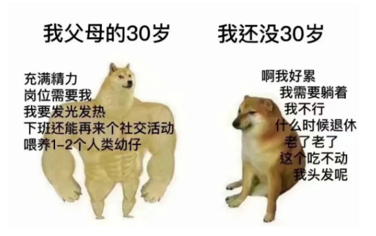 之前网上曾流传过一张图,父母的30岁&我还没30岁。父母辈的30岁,对工作充满热情和斗志,下班还能把生活搞得丰富多彩;而我们还没到30岁,就已经未老先衰……