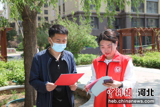 图为社区志愿者在向居民发放消防安全知识宣传单。 王嘉祺 摄