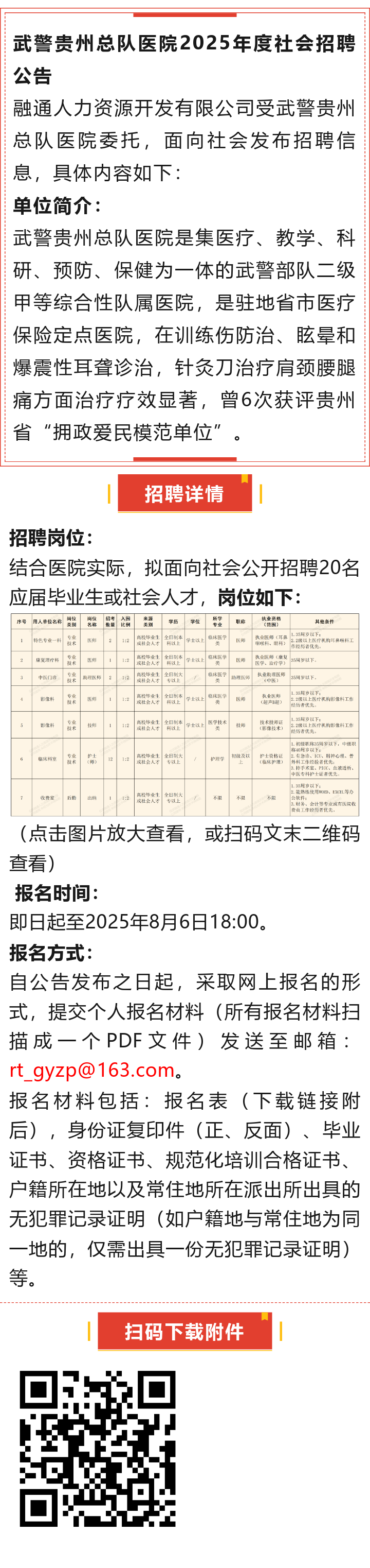 武警贵州总队医院招聘!报名截止时间:2025年8月6日!
