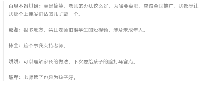 视频里,一名学生因上课爱说话被戴上了“小蜜蜂”扩音器。相关视频很快引发关注并被广泛转发,还有不少网友晒出自己给班上学生戴“小蜜蜂”的视频,并表示这种方法很有效。